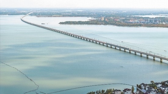11月23日,蘇州吳江區(qū),滬蘇湖高鐵試運(yùn)行列車跨過元蕩。 袁新宇 周悅磊 攝 (視覺江蘇網(wǎng)供圖)