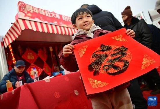 1月18日,一名小男孩在泊里大集非遺互動區(qū)領(lǐng)取福字。