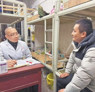 2月8日晚,在筠連縣第二中學(xué)校安置點(diǎn),筠連縣中醫(yī)院的醫(yī)生正在了解安置群眾身體情況。