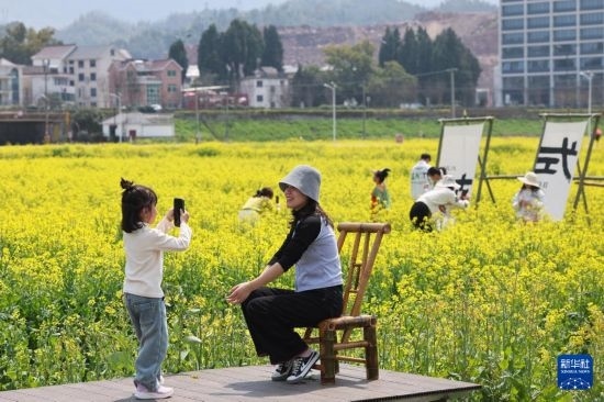 3月23日,游客在更樓街道城南城市田園的油菜花田打卡拍照。