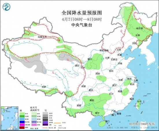 4月7日08時(shí)至8日08時(shí),新疆南疆西部和南部山區(qū)、內(nèi)蒙古東北部、黑龍江中北部、西藏西北部、青海北部等地部分地區(qū)有小雪或雨夾雪。新疆伊犁河谷、寧夏、陜西北部、黑龍江南部、吉林、云南南部、貴州中南部、廣西大部、湖南中西部、安徽南部、海南島、臺灣島等地部分地區(qū)有小雨,局地有中雨。內(nèi)蒙古大部、西藏北部、甘肅河西、川西高原北部等地部分地區(qū)有4~6級風(fēng),陣風(fēng)7級。