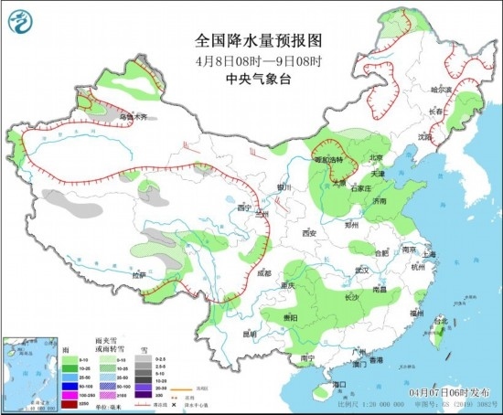 4月8日08時(shí)至9日08時(shí),新疆北部、內(nèi)蒙古中東部、西藏北部、青海南部等地有小到中雪或雨夾雪,內(nèi)蒙古中部、陜西北部、山西、河北北部和南部、山東、貴州東部和南部、湖南中南部、江西中部、廣西中北部、海南島、臺灣島等地有小到中雨。內(nèi)蒙古大部、甘肅河西、陜西中北部、山西等地部分地區(qū)有4~6級風(fēng),陣風(fēng)7級。