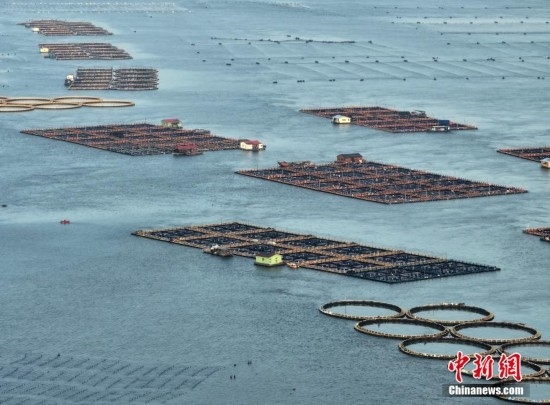 5月2日,福建福州福清市沙埔鎮(zhèn)養(yǎng)殖海域,養(yǎng)殖網(wǎng)箱漂浮在海面上,海上風(fēng)車依次排開(kāi),蔚為壯觀。(無(wú)人機(jī)照片)