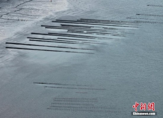 5月2日,福建福州福清市沙埔鎮(zhèn)養(yǎng)殖海域,退潮后灘涂猶如一幅天然的水墨畫卷。(無(wú)人機(jī)照片)
