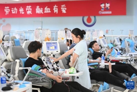 5月7日,在天津市血液中心,護(hù)士查看獻(xiàn)血者的狀態(tài)。