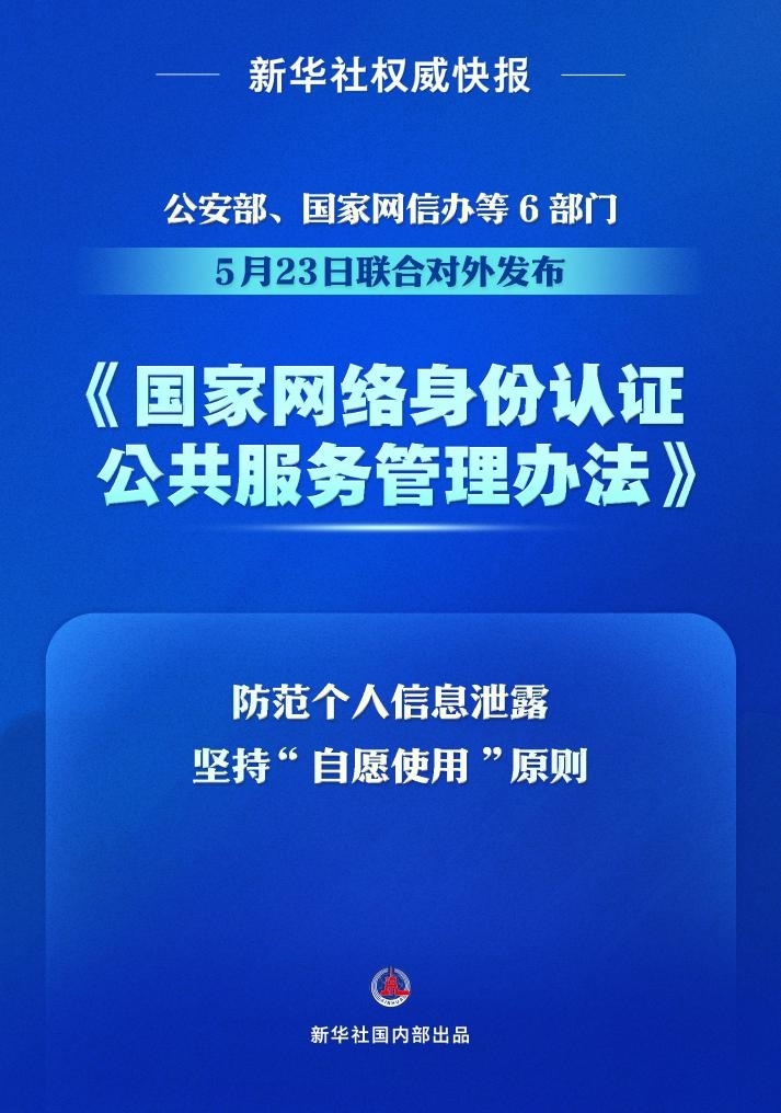 破解公民身份信息網絡泄露難題,加強個人信息保護。公安部、國家網信辦等6部門5月23日聯合對外發(fā)布《國家網絡身份認證公共服務管理辦法》,推進國家網絡身份認證公共服務建設,進一步推廣應用公共服務。