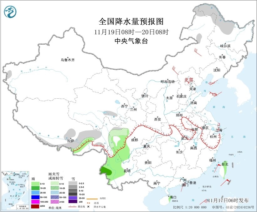 全國降水量預(yù)報圖(11月19日08時-20日08時)