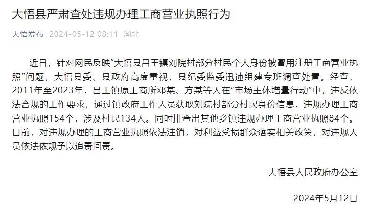 上百村民身份被冒用注冊營業(yè)執(zhí)照,官方通報:追責問責 目前,對違規(guī)辦理的工商營業(yè)執(zhí)照依法注銷,對利益受損......