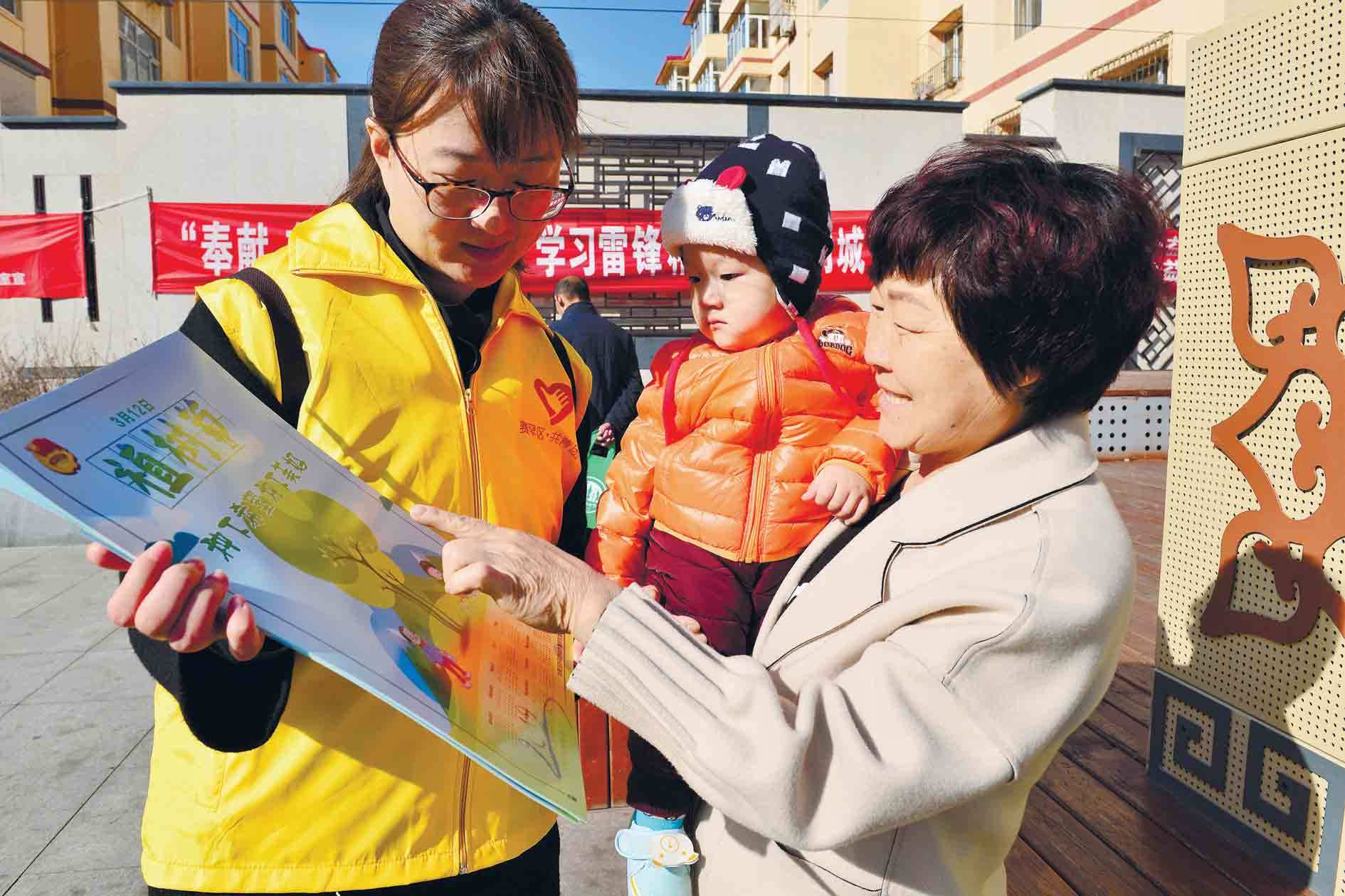 3月12日,志愿者在呼和浩特市賽罕區(qū)金地文化廣場上為市民發(fā)放宣傳資料。當(dāng)日,賽罕區(qū)綠化委員會辦公室舉辦了“3·12植樹節(jié)”宣傳活動。據(jù)悉,2018年賽罕區(qū)完成植樹958萬株(叢),人均公園綠地面積19.1平方米,建成區(qū)綠化覆蓋率42.3%。(內(nèi)蒙古日報(bào)社融媒體記者 安寅東)