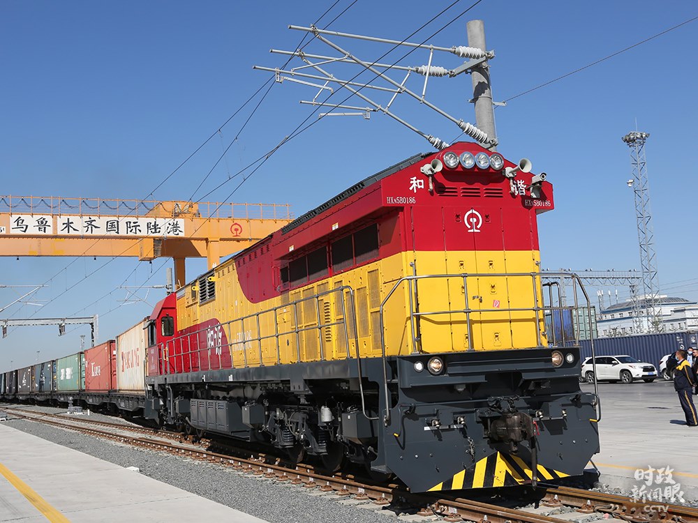 △9月8日,烏魯木齊國際陸港區(qū),一列滿載日用品的中歐班列啟程。