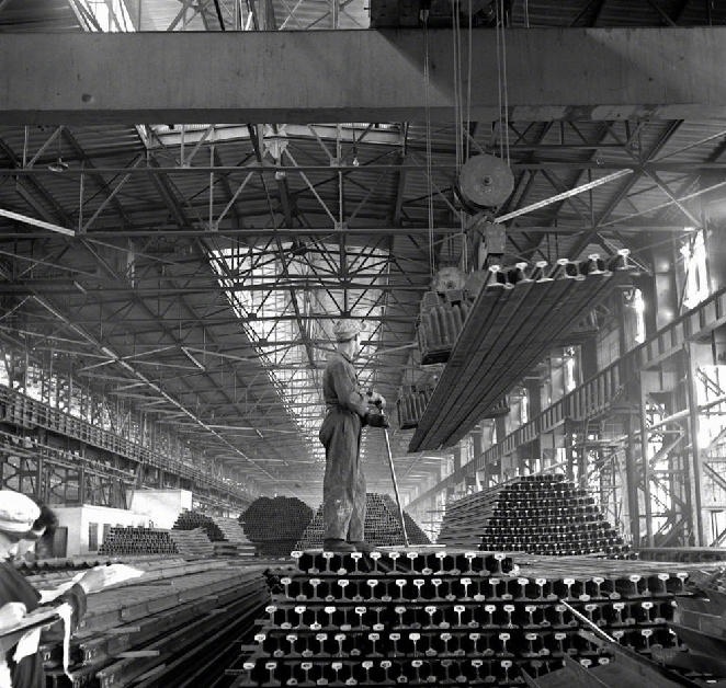 “一五”期間,鞍鋼興建的第一座大型軋鋼廠生產(chǎn)能力已迅速超過設(shè)計標(biāo)準(zhǔn)。這是這個廠生產(chǎn)的大批鋼軌(攝于1957年4月)。
