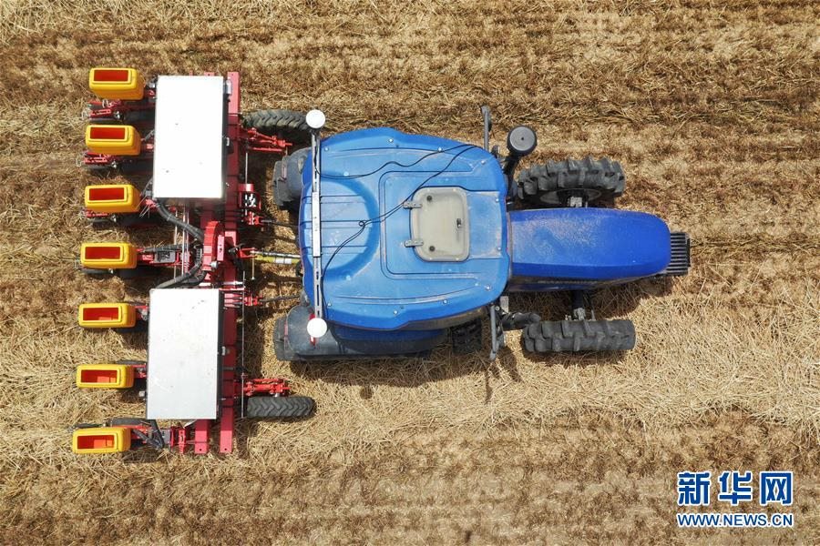在河南省鄧州市小楊營(yíng)鎮(zhèn)安眾村,加裝有北斗導(dǎo)航系統(tǒng)的拖拉機(jī)在無(wú)人駕駛狀態(tài)下播種(2020年5月26日攝,無(wú)人機(jī)照片)。新華社記者馮大鵬攝