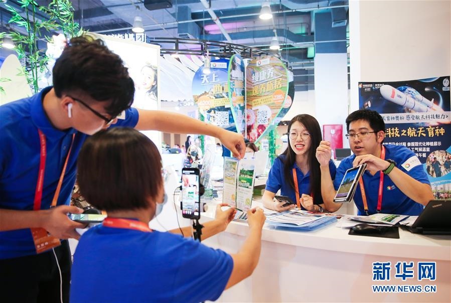 在2020年中國(guó)國(guó)際服務(wù)貿(mào)易交易會(huì)旅游服務(wù)專題展區(qū),中國(guó)旅游集團(tuán)展位的工作人員通過(guò)直播向線上觀眾介紹旅游服務(wù)產(chǎn)品(2020年9月5日攝)。新華社記者潘思危攝