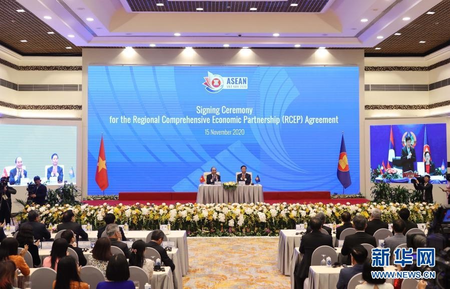 這是2020年11月15日在越南首都河內(nèi)拍攝的區(qū)域全面經(jīng)濟(jì)伙伴關(guān)系協(xié)定(RCEP)簽署儀式現(xiàn)場(chǎng)。新華社/越通社