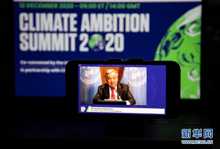 這是2020年12月12日在美國(guó)紐約拍攝的聯(lián)合國(guó)秘書長(zhǎng)古特雷斯在氣候雄心峰會(huì)上通過視頻發(fā)表講話的屏幕畫面。氣候雄心峰會(huì)由聯(lián)合國(guó)及有關(guān)國(guó)家倡議舉辦,旨在紀(jì)念《巴黎協(xié)定》達(dá)成五周年,進(jìn)一步動(dòng)員國(guó)際社會(huì)強(qiáng)化氣候行動(dòng),推進(jìn)多邊進(jìn)程。新華社記者 王迎 攝