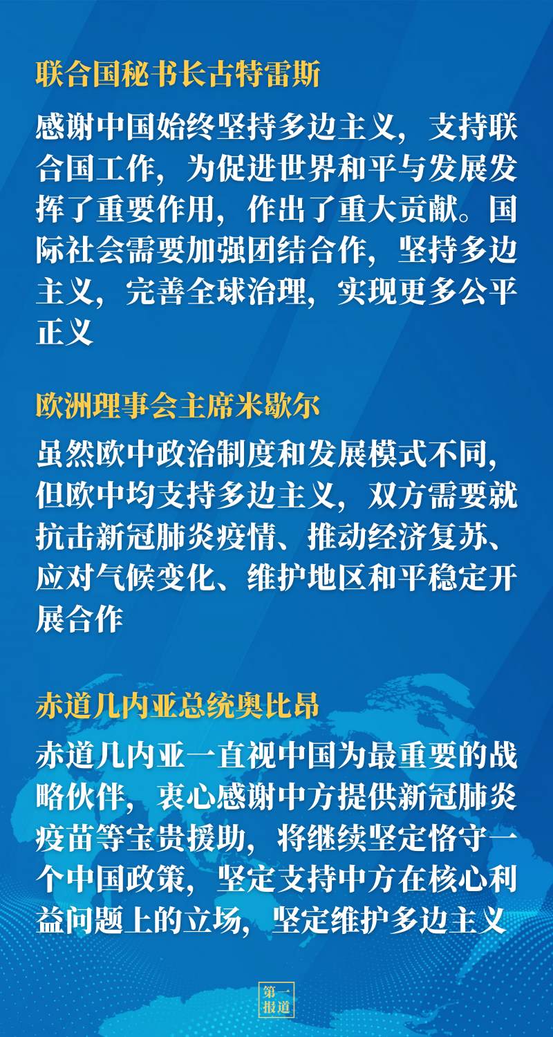 在同聯(lián)合國秘書長古特雷斯、歐洲理事會主席米歇爾、巴基斯坦總理伊姆蘭·汗、巴布亞新幾內(nèi)亞總理馬拉佩、赤道幾內(nèi)亞總統(tǒng)奧比昂等國際和地區(qū)組織以及國家領(lǐng)導(dǎo)人的交流中,習(xí)近平主席都分別同各方就堅持真正的多邊主義深入交流,獲得積極反饋——