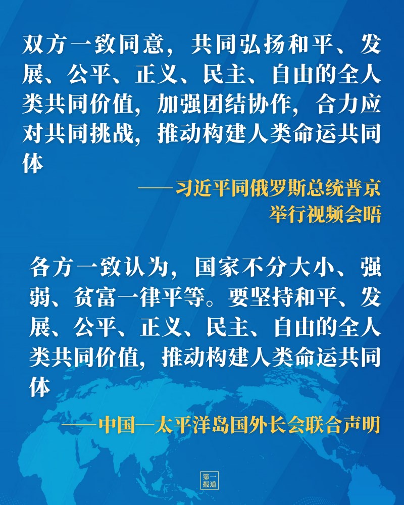 從同普京總統(tǒng)視頻會晤、同菲律賓總統(tǒng)杜特爾特通電話,到第七十屆聯(lián)合國大會一般性辯論、世界經(jīng)濟(jì)論壇“達(dá)沃斯議程”對話會、中國共產(chǎn)黨與世界政黨領(lǐng)導(dǎo)人峰會等多邊場合,習(xí)近平主席多次闡述全人類共同價值的深刻內(nèi)涵,凝聚中外共識。