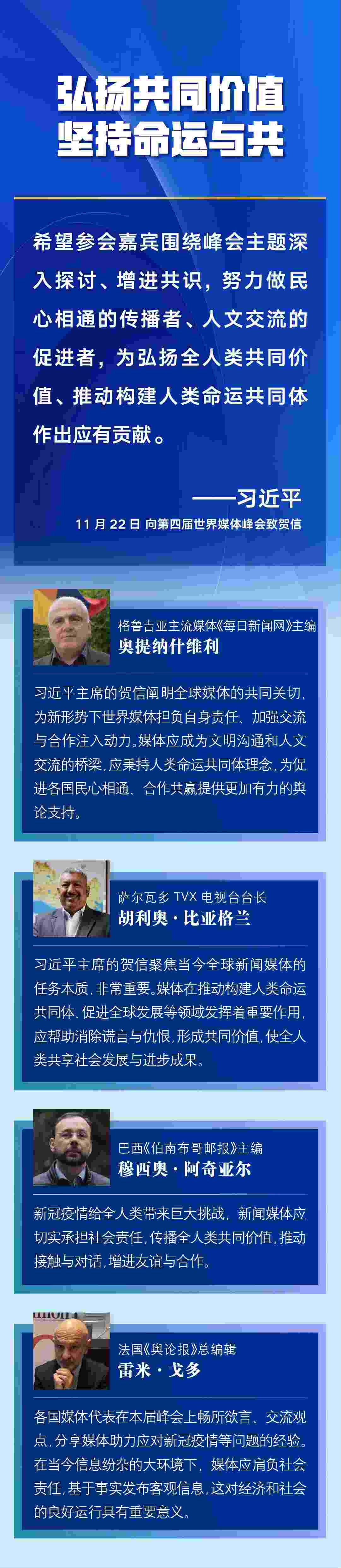 多國媒體人士認為,習近平主席的賀信對全球媒體更好肩負社會責任、廣泛凝聚世界共識作出重要闡述,為新形勢下世界媒體加強交流與合作、弘揚全人類共同價值、推動構建人類命運共同體注入新的推動力——