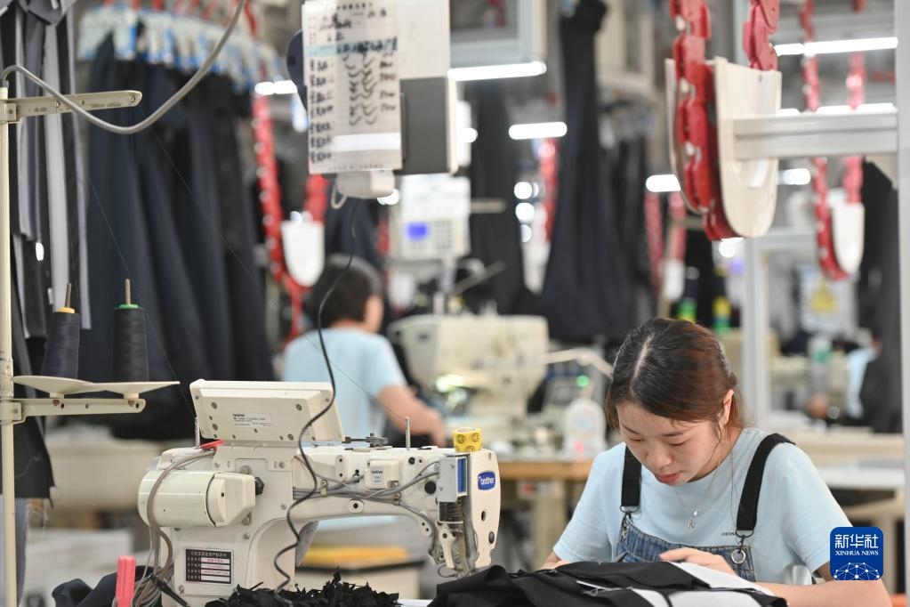 在位于福建省泉州市經(jīng)濟技術(shù)開發(fā)區(qū)的九牧王西褲智能化生產(chǎn)車間,工人在自動化西褲吊掛流水線上作業(yè)(7月30日攝)。新華社記者宋為偉攝