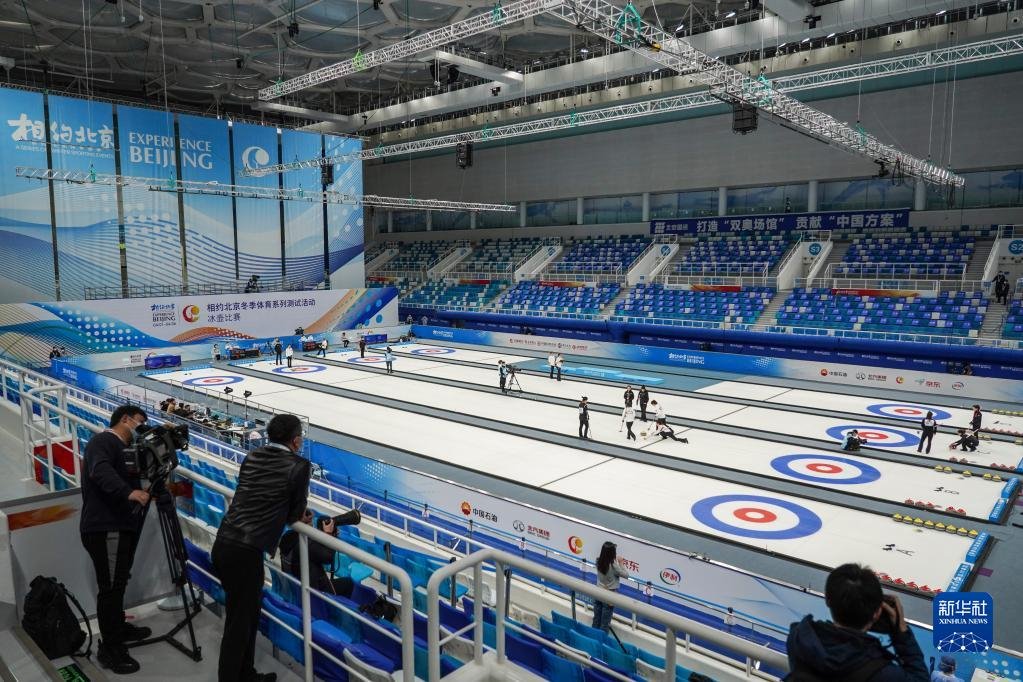 2021年4月6日,運(yùn)動員在冰壺項目測試活動中。2022年北京冬奧會將國家游泳中心“水立方”改造為“冰立方”,用作冰壺項目比賽場館,有效減少建設(shè)投資,更讓夏奧場館煥然新生,拓展多元賽后經(jīng)營能力。新華社記者彭子洋攝