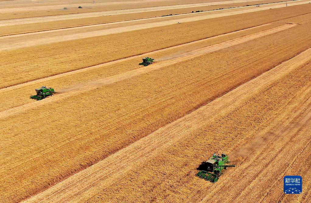 在河南省黃泛區(qū)農(nóng)場九分場的麥田里,農(nóng)機(jī)手操作收割機(jī)收獲小麥(無人機(jī)照片,2021年6月6日攝)。新華社記者李安攝