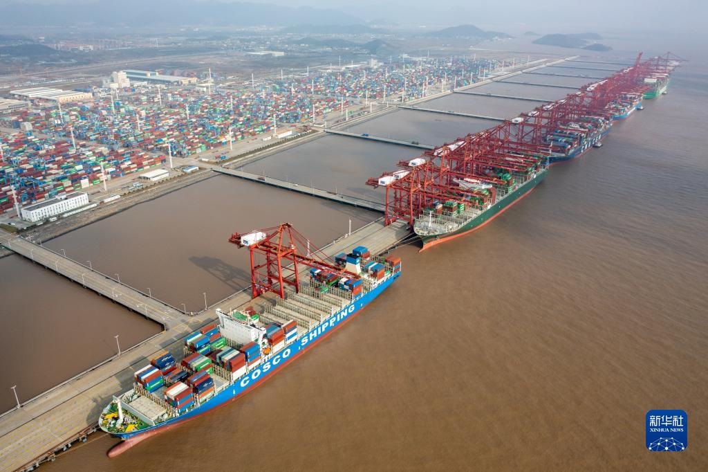 浙江寧波舟山港梅山港區(qū)集裝箱碼頭一派繁忙景象(2021年12月17日攝,無人機(jī)照片)。新華社發(fā)(蔣曉東攝)