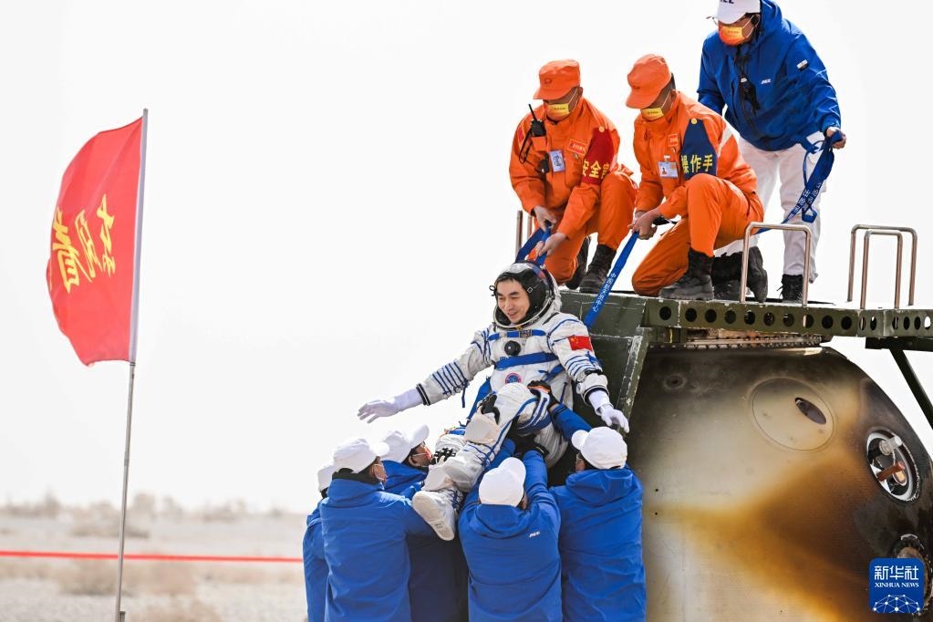 4月16日,神舟十三號載人飛船返回艙在東風(fēng)著陸場成功著陸。這是航天員葉光富安全順利出艙。新華社記者 連振 攝