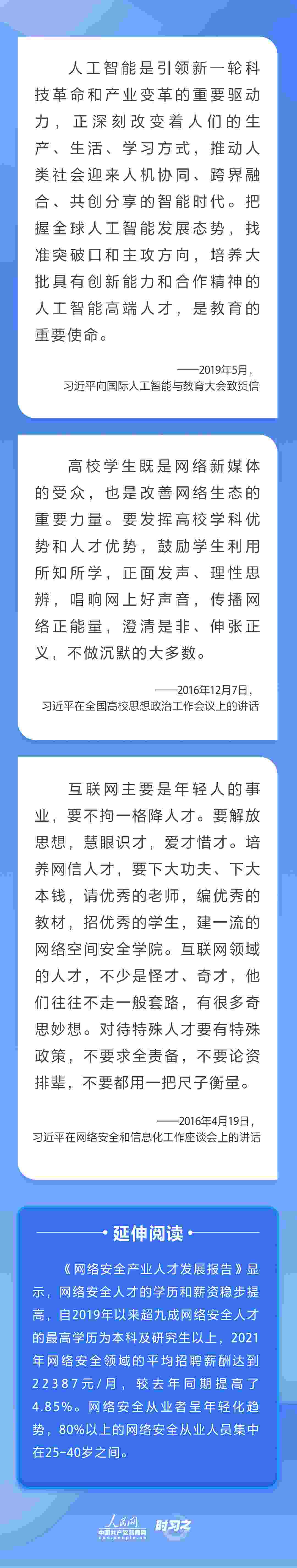“網(wǎng)信領(lǐng)域是技術(shù)密集型、創(chuàng)新密集型領(lǐng)域,千軍易得、一將難求,必須聚天下英才而用之?!秉h的十八大以來,習(xí)近平總書記多次就網(wǎng)信事業(yè)發(fā)展作出重要論述,并將抓好人才工作擺在治國理政的重要位置,為新時代網(wǎng)信人才工作和網(wǎng)信人才事業(yè)發(fā)展指明了前進方向。