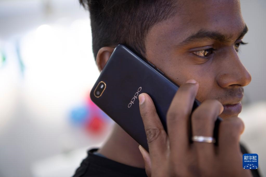 2019年10月8日,一名男子在印度金奈的一家商場(chǎng)使用中國品牌的手機(jī)。新華社記者呂小煒攝