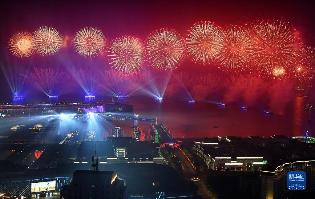 這是在青島舉行的《有朋自遠(yuǎn)方來(lái)》燈光焰火藝術(shù)表演(2018年6月9日晚攝)。2018年6月9日至10日,上海合作組織成員國(guó)元首理事會(huì)第十八次會(huì)議在青島召開(kāi)。新華社記者李紫恒攝