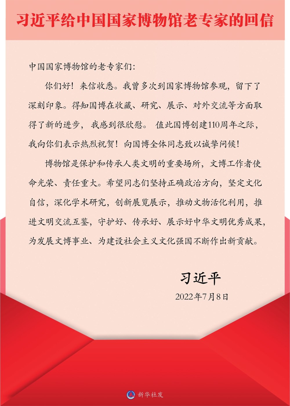 7月8日,中共中央總書(shū)記、國(guó)家主席、中央軍委主席習(xí)近平給中國(guó)國(guó)家博物館的老專(zhuān)家回信,在國(guó)博創(chuàng)建110周年之際,向國(guó)博全體同志致以熱烈祝賀和誠(chéng)摯問(wèn)候。