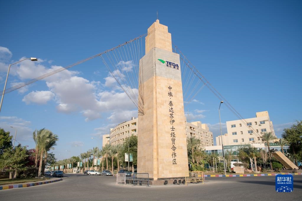 這是2021年1月14日在埃及蘇赫奈泉拍攝的中?!ぬ┻_蘇伊士經(jīng)貿(mào)合作區(qū)大門。新華社記者 鄔惠我 攝
