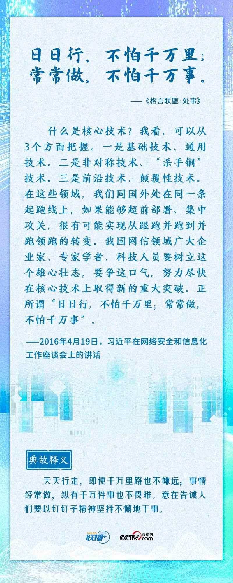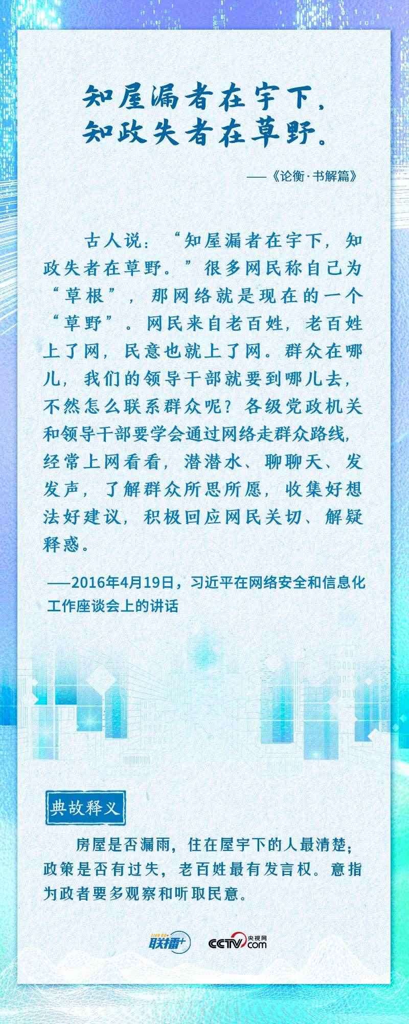 “知屋漏者在宇下,知政失者在草野”“日日行,不怕千萬里;常常做,不怕千萬事”......2016年4月19日,習近平總書記在網(wǎng)絡安全和信息化工作座談會上,從六個方面深刻回答了事關(guān)我國網(wǎng)信事業(yè)發(fā)展的一系列重大理論和實踐問題,并多次引經(jīng)據(jù)典加以闡述。