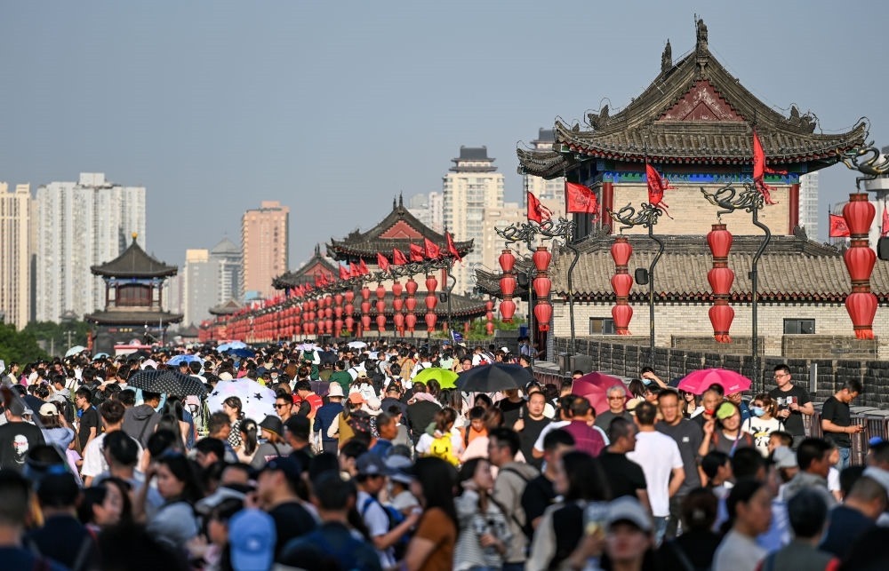 游客在西安城墻景區(qū)參觀游覽(4月30日攝)。新華社發(fā)(鄒競(jìng)一 攝)