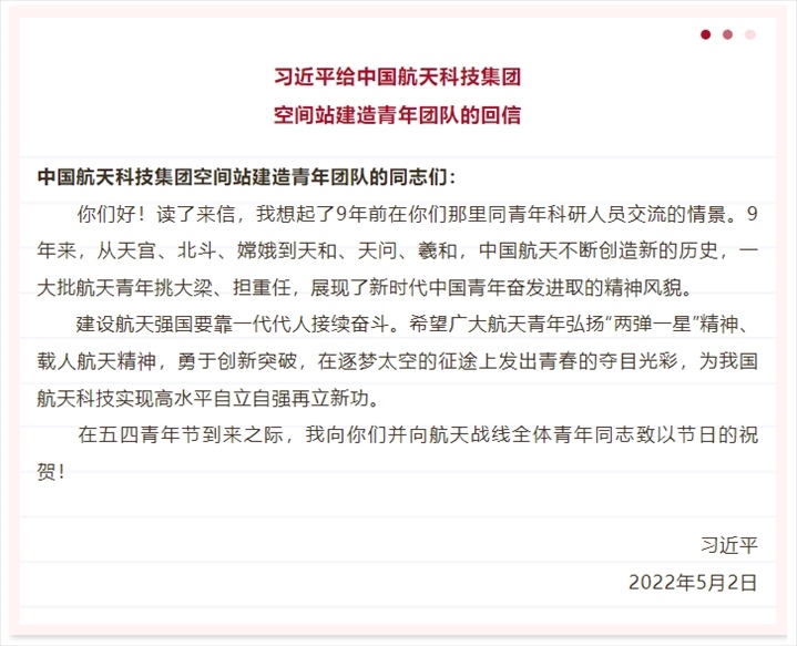 衛(wèi)星發(fā)射前,科普小衛(wèi)星研制團隊的學(xué)生們給習(xí)近平總書記寫信,報告了小衛(wèi)星即將發(fā)射的消息??倳浽诨匦胖邢M⒆觽儭氨3謱χR的渴望,保持對探索的興趣,培育科學(xué)精神,刻苦學(xué)習(xí),努力實踐”。