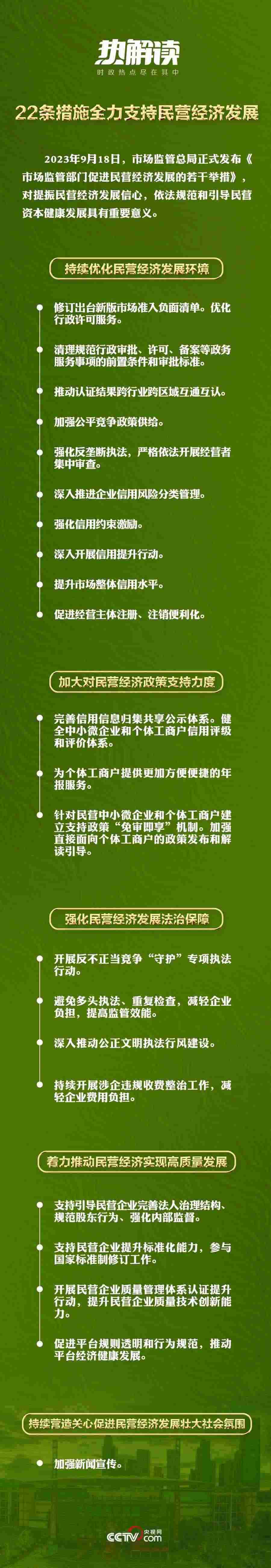 2023年7月14日,中共中央國務(wù)院出臺《關(guān)于促進民營經(jīng)濟發(fā)展壯大的意見》,對促進民營經(jīng)濟發(fā)展壯大作出新的重大部署。2023年9月18日,市場監(jiān)管總局發(fā)布《市場監(jiān)管部門促進民營經(jīng)濟發(fā)展的若干舉措》,通過22條措施為全力支持民營經(jīng)濟發(fā)展設(shè)計了具體落實的“施工圖”。