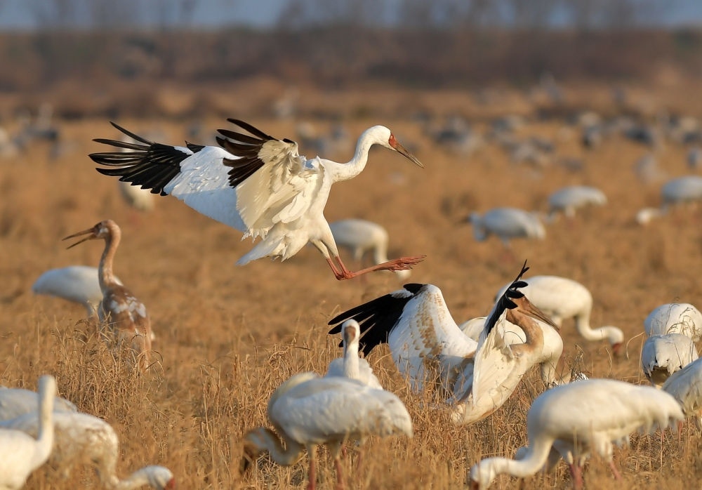 這是2021年1月15日在鄱陽湖畔的江西余干縣康山墾殖場插旗洲拍攝的白鶴。隨著長江重點(diǎn)水域生態(tài)修復(fù)措施的落實(shí),鄱陽湖環(huán)境正發(fā)生嬗變。江西鄱陽湖國家級自然保護(hù)區(qū)管理局2022年新年伊始發(fā)布的鄱陽湖區(qū)最新鳥情數(shù)據(jù)顯示,工作人員在野外監(jiān)測統(tǒng)計(jì)到水鳥76.6萬余只,創(chuàng)有監(jiān)測記錄以來新高。