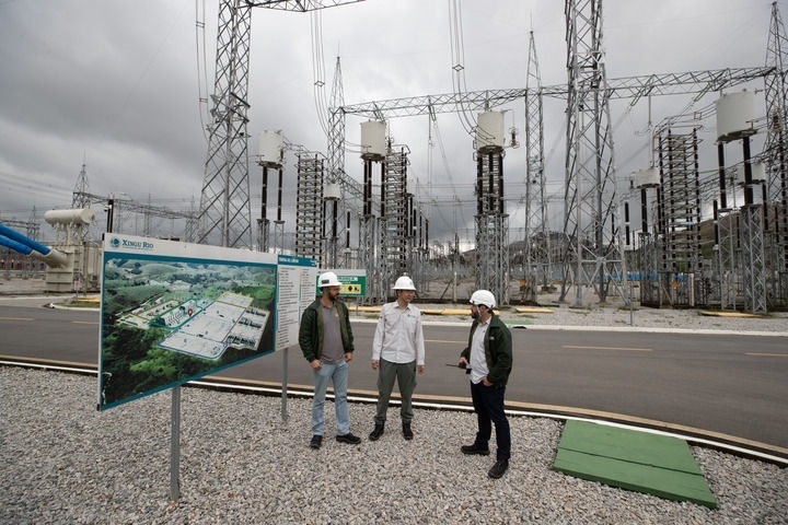 2022年9月30日,在巴西里約熱內(nèi)盧美麗山特高壓輸電二期項目里約換流站,國網(wǎng)巴控公司換流站運維主管(中)和巴方人員交談。新華社記者 王天聰 攝