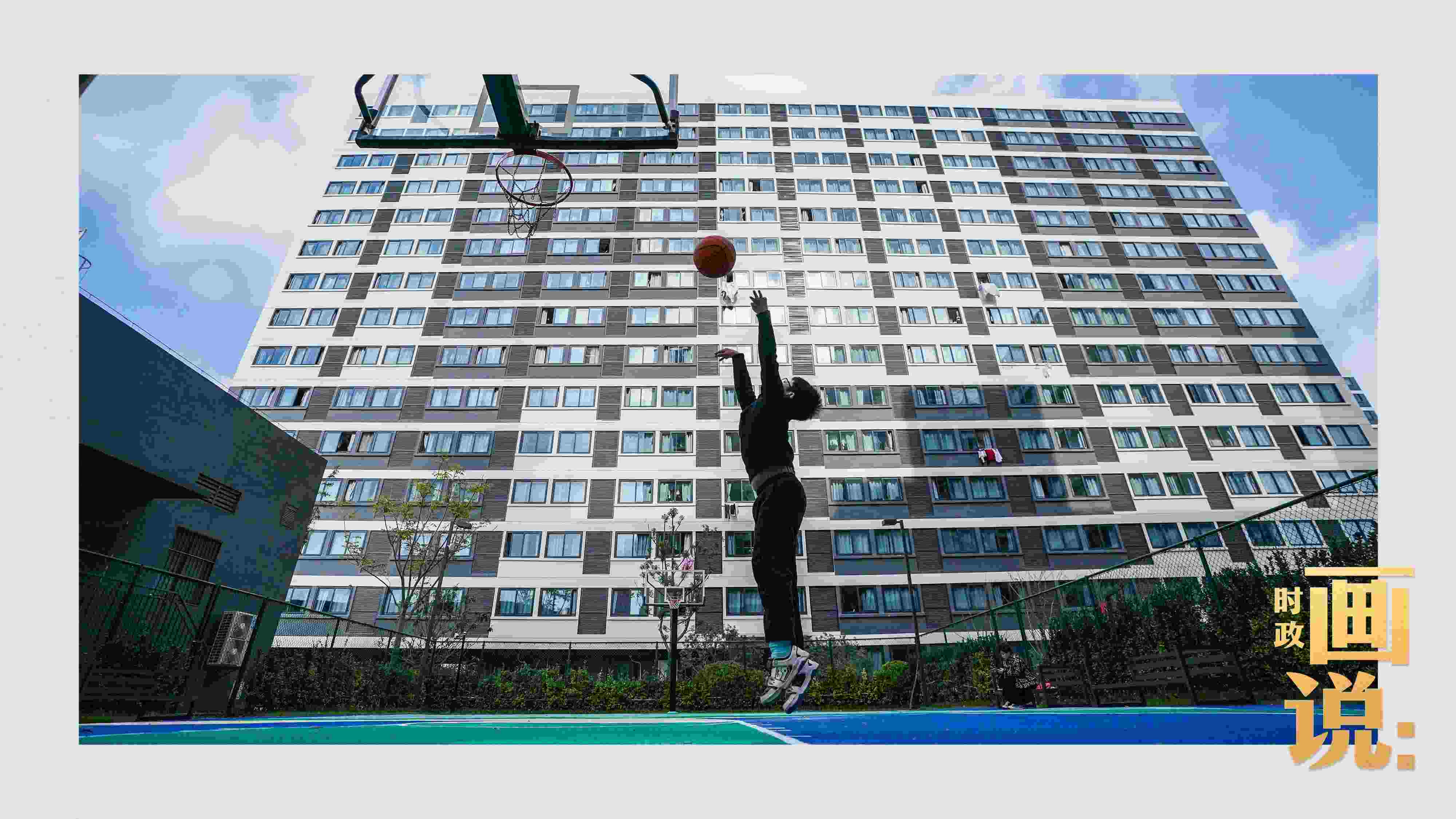 △社區(qū)籃球場(chǎng)上練習(xí)投籃的小男孩。閔行區(qū)新時(shí)代城市建設(shè)者管理者之家所在的社區(qū)是上海市首批大型保障性租賃住房項(xiàng)目之一,為許多來(lái)滬新市民、青年人和一線務(wù)工人員提供住房保障。閔行區(qū),上海。