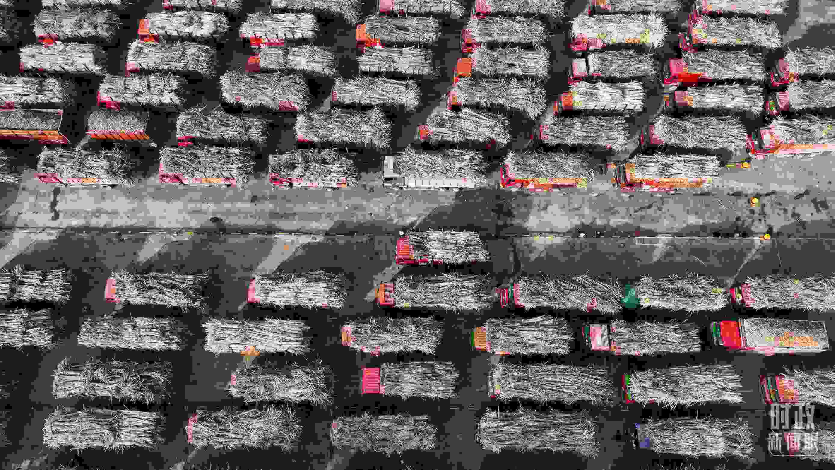 △來賓東糖鳳凰有限公司內(nèi)的甘蔗原料停放區(qū)。(總臺央視記者范凱拍攝)
