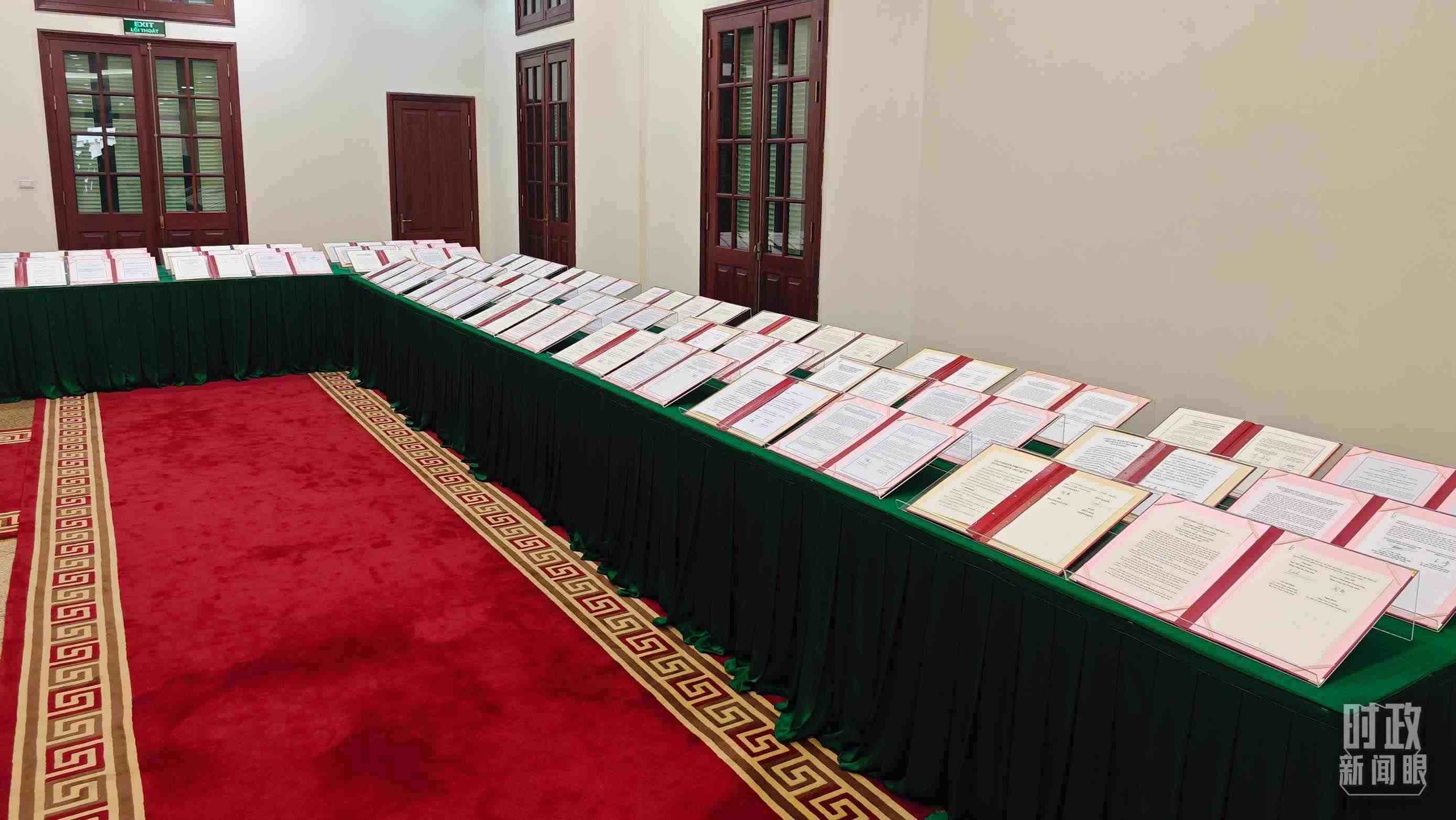 △ 2023年12月,習近平主席抵達越南河內,開啟年內的第四次出訪。圖為中越雙方簽署的雙邊合作文件展示,涵蓋共建“一帶一路”等30多個領域。(總臺央視記者耿小龍拍攝)