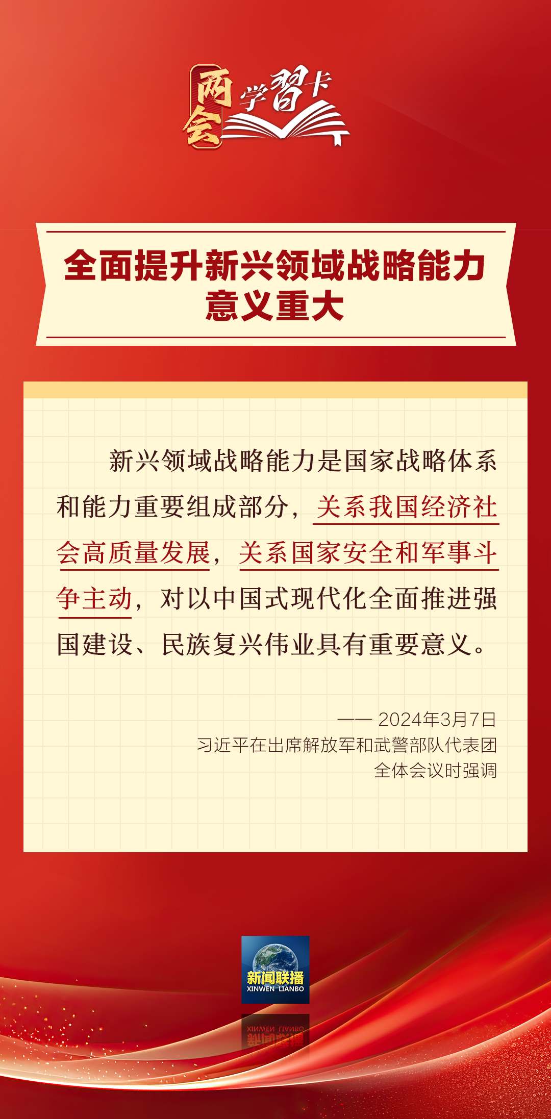 3月7日,習(xí)近平在出席解放軍和武警部隊(duì)代表團(tuán)全體會(huì)議時(shí)強(qiáng)調(diào),強(qiáng)化使命擔(dān)當(dāng),深化改革創(chuàng)新,全面提升新興領(lǐng)域戰(zhàn)略能力。如何提升新興領(lǐng)域戰(zhàn)略能力?一起學(xué)習(xí)↓↓↓