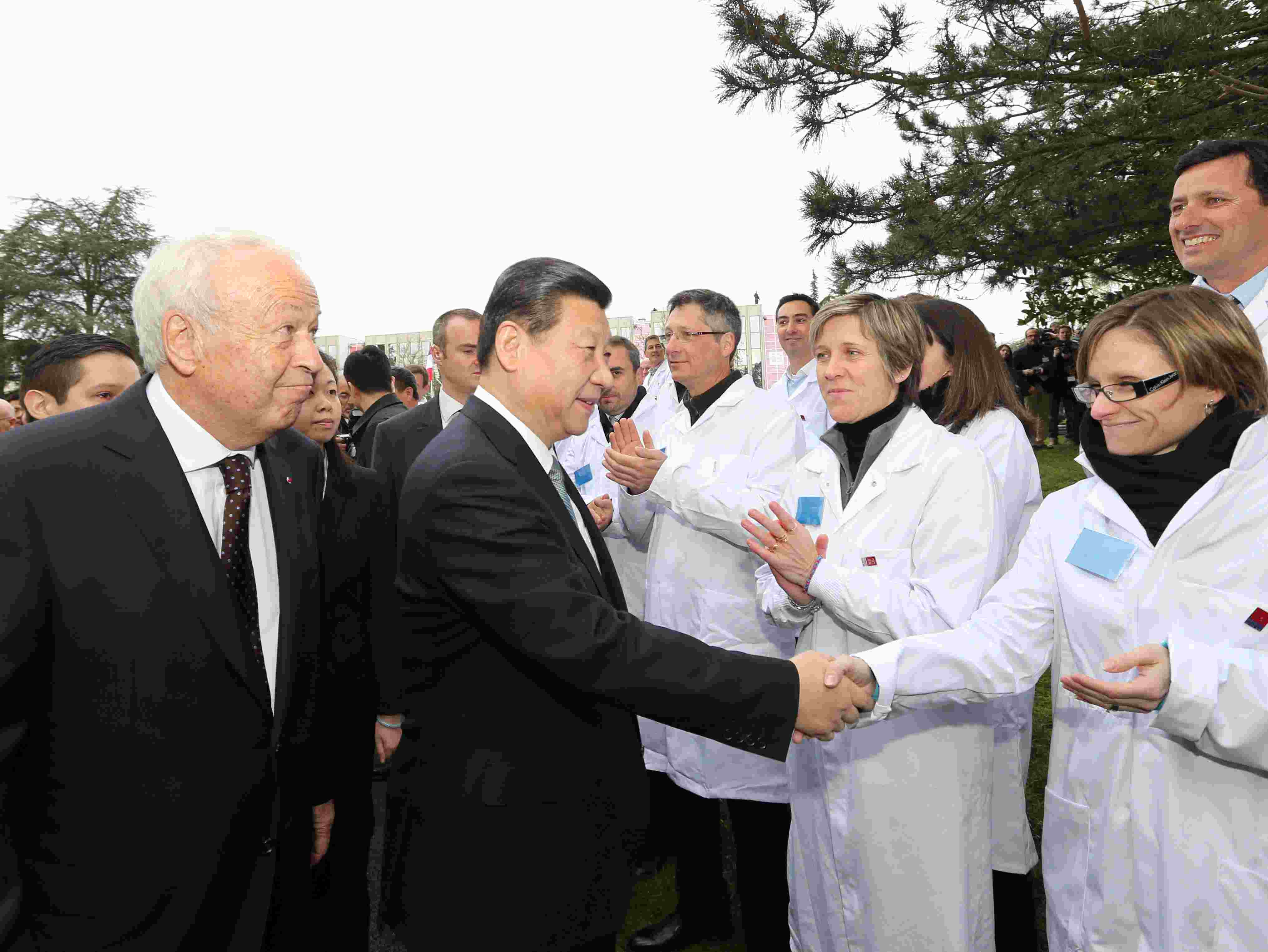 △2014年3月26日,習(xí)近平主席在法國(guó)里昂參觀梅里埃生物科研中心,與科研中心員工握手。