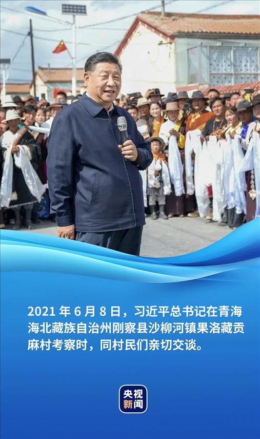 藍(lán)天白云下,一排排紅瓦黃墻的平房小院錯落有致,筆直整潔的村道兩旁立著太陽能路燈。村民索南才讓帶著一家三代站在家門口,向總書記獻(xiàn)上潔白的哈達(dá)。