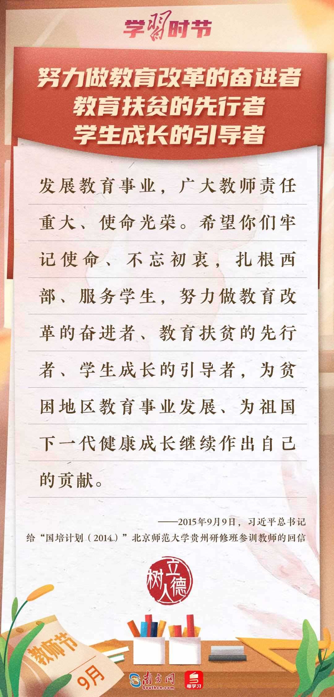 “百年大計(jì),教育為本。教育大計(jì),教師為本?!秉h的十八大以來(lái),習(xí)近平總書(shū)記多次以書(shū)信形式向教師群體和教育工作者表達(dá)囑托與期望,諄諄話語(yǔ),催人奮進(jìn)。在第四十個(gè)教師節(jié)到來(lái)之際,讓我們一起重溫總書(shū)記的諄諄寄語(yǔ)!