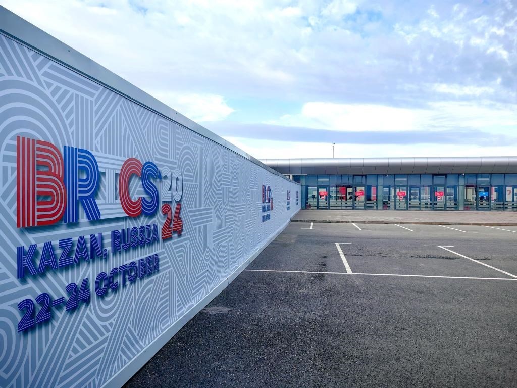 這是2024年10月23日在俄羅斯喀山金磚峰會(huì)新聞中心拍攝的金磚峰會(huì)標(biāo)識(shí)。新華社記者 申宏 攝