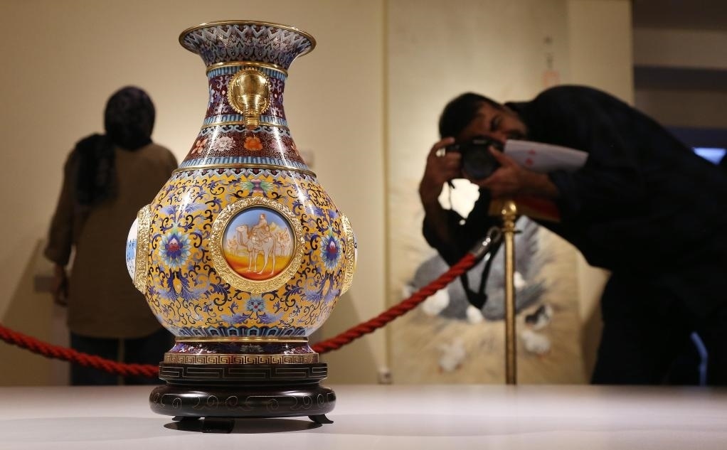 2024年10月12日,在伊朗首都德黑蘭的馬利克國(guó)家博物館,觀眾在“絲路長(zhǎng)云——中國(guó)藝術(shù)文化精品展”現(xiàn)場(chǎng)拍攝展品。新華社記者 沙達(dá)提 攝
