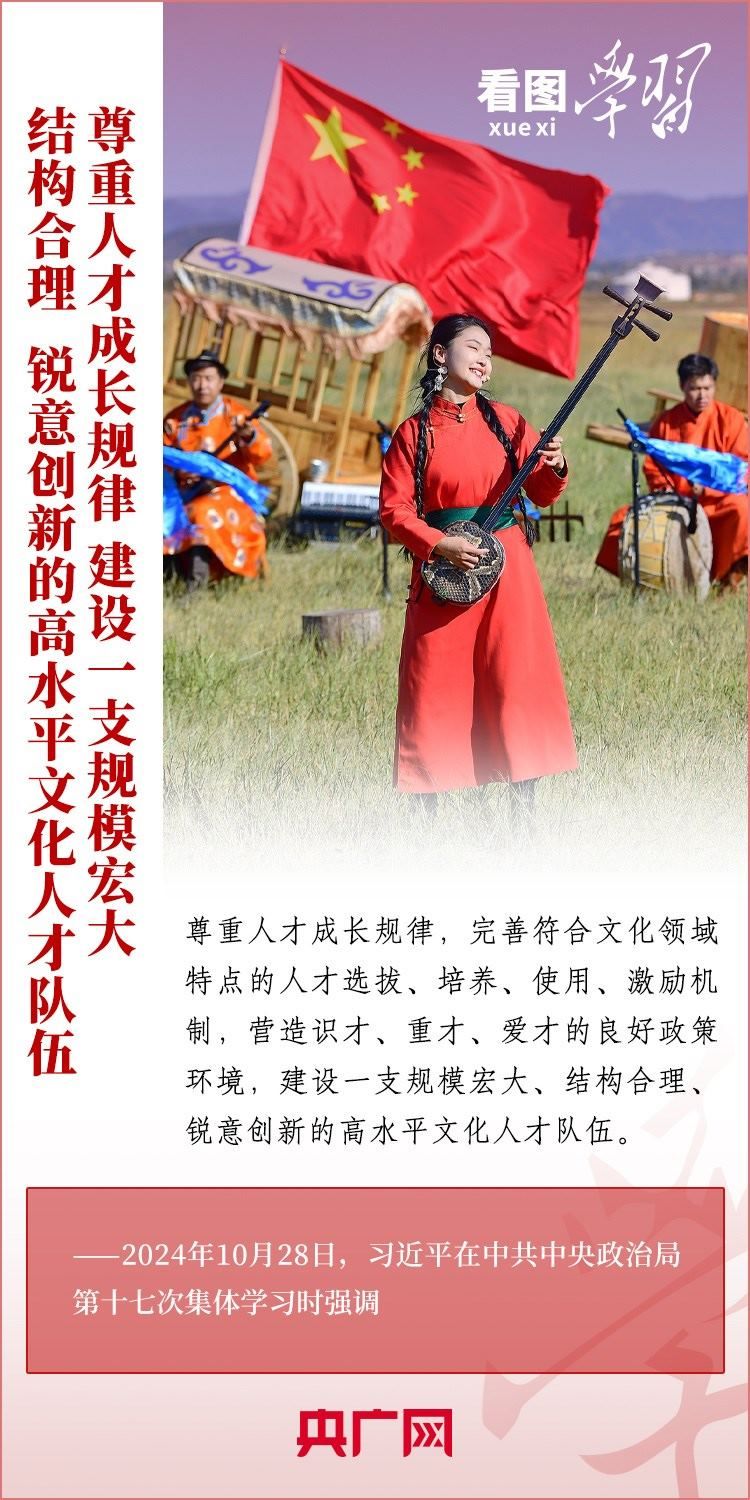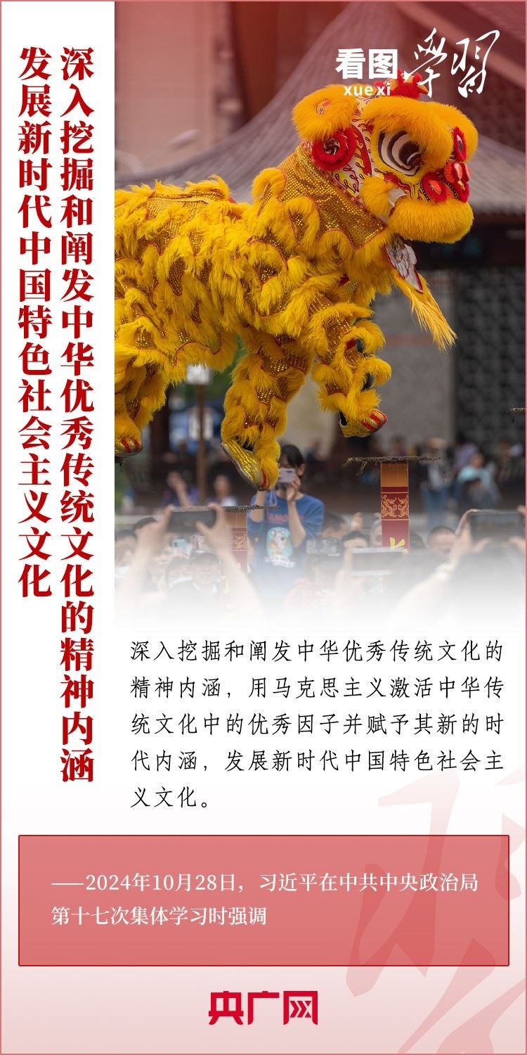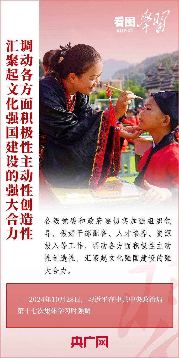 建設(shè)文化強國是全黨全社會的共同任務(wù)。10月28日,中共中央政治局就建設(shè)文化強國進行第十七次集體學(xué)習(xí)。習(xí)近平總書記在聽取講解和討論后發(fā)表重要講話,就錨定2035年建成文化強國戰(zhàn)略目標(biāo)作出最新部署,強調(diào)要“不斷發(fā)展具有強大思想引領(lǐng)力、精神凝聚力、價值感召力、國際影響力的新時代中國特色社會主義文化,不斷增強人民精神力量,筑牢強國建設(shè)、民族復(fù)興的文化根基?!币黄饋韺W(xué)習(xí)!