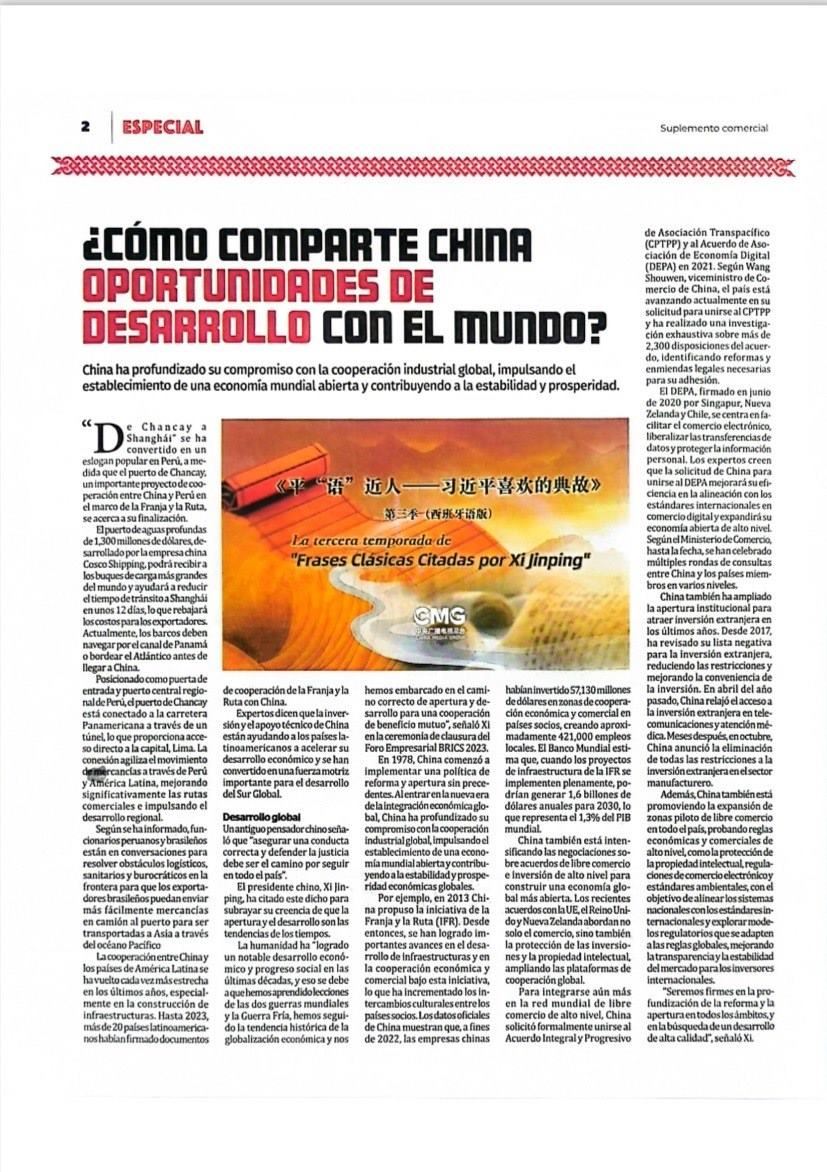11月14日,秘魯最具影響力的官方報紙《秘魯人報》刊發(fā)節(jié)目在秘魯落播的消息。文章指出,《平“語”近人——習近平喜歡的典故》第三季展現(xiàn)了中華民族開放包容、兼收并蓄的文化胸懷,闡釋了習近平主席提出的推動構(gòu)建人類命運共同體的這一重大理念,是對“建設(shè)一個什么樣的世界、怎樣建設(shè)這個世界”給出的中國方案。《秘魯人報》特刊整版刊發(fā)《平“語”近人——習近平喜歡的典故》第三季(西班牙語版)將在秘魯主流媒體落播特稿?!睹佤斎藞蟆饭倬W(wǎng)也同步刊發(fā)了節(jié)目預告消息和海報。