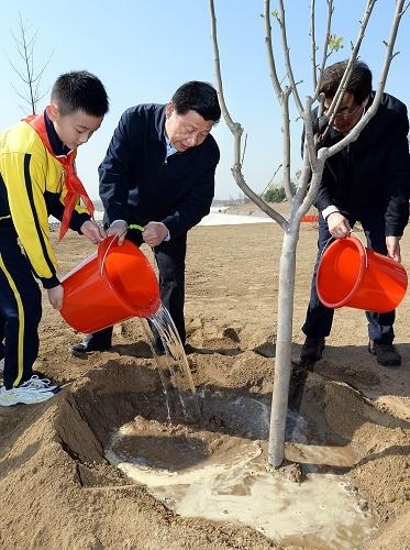 2014年4月,南水北調(diào)中線(xiàn)一期工程通水前夕,配套工程北京團(tuán)城湖調(diào)節(jié)池迎來(lái)了種樹(shù)人習(xí)近平。在那里,他接連種下了6棵樹(shù),植樹(shù)結(jié)束,還向工程負(fù)責(zé)人了解了南水北調(diào)水源的水質(zhì)與保護(hù)等問(wèn)題。
